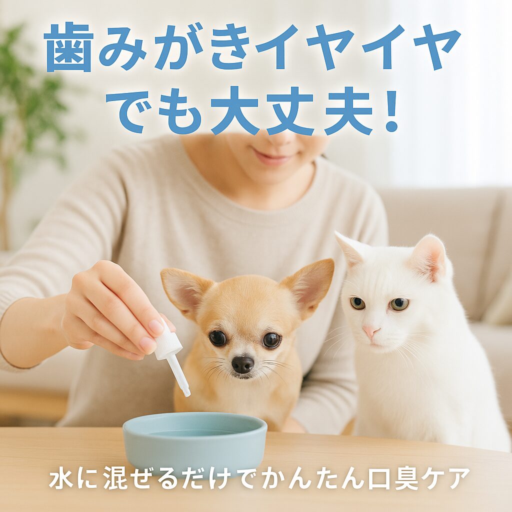 そんなワンちゃん・ネコちゃんでも、水に混ぜるだけで口臭ケアができるのが、