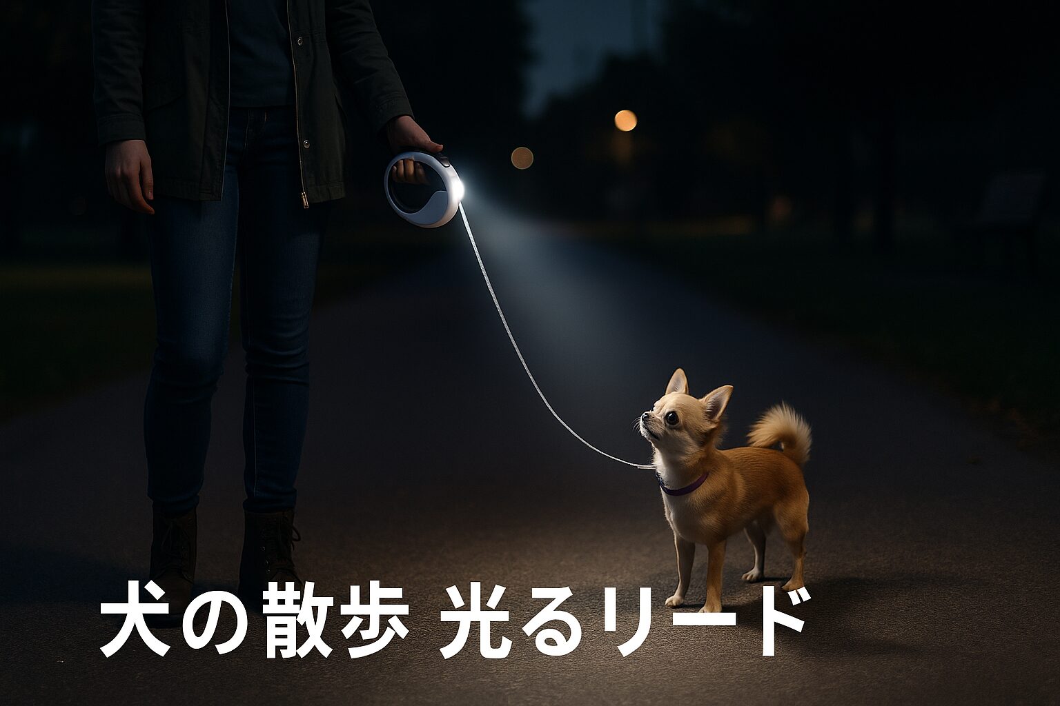 夜の公園で、光ったリードに照らされて